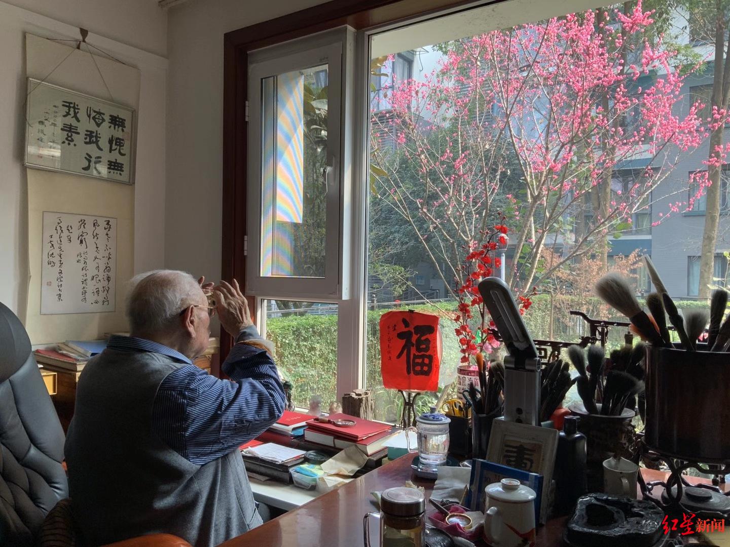 马识途在书房欣赏屋外的红梅(马识途女儿马万梅拍摄)