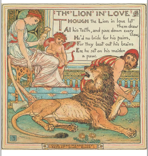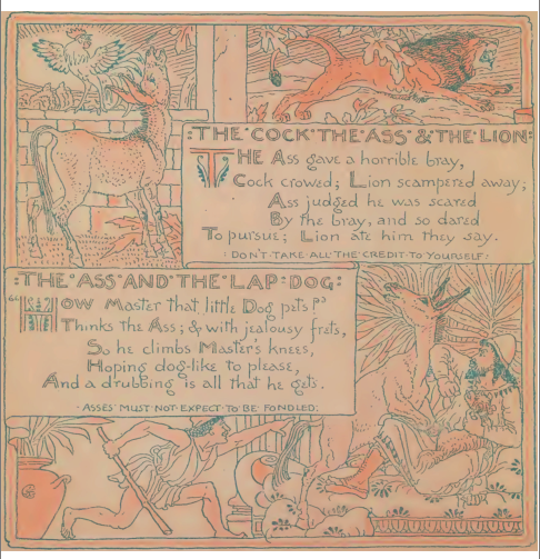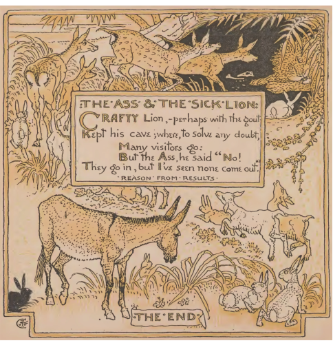 这本《宝宝的伊索》原作者是林顿(William James Linton,1812—1897),科瑞恩(Walter Crane,1845—1915)画的插图。前者是刻版师兼诗人,拥有当时英国最好的雕印作坊。后者为肖像画家之子,很早就显露才华,被视为神童。他按英国桂冠诗人丁尼生名作《女郎夏洛特》创作的同名画,既得到文艺评论家罗斯金(John Ruskin,1819—1900)称赞,也受林顿赏识,收了这14岁少年为徒。科瑞恩17岁开始自立门户,此后才华尽显,涉及各种领域,不仅做了大量童书插图,创建英国工艺美术协会,担任英国皇家艺术学院院长,还写出《插图历史》和《设计的基础》等著作,影响深远。