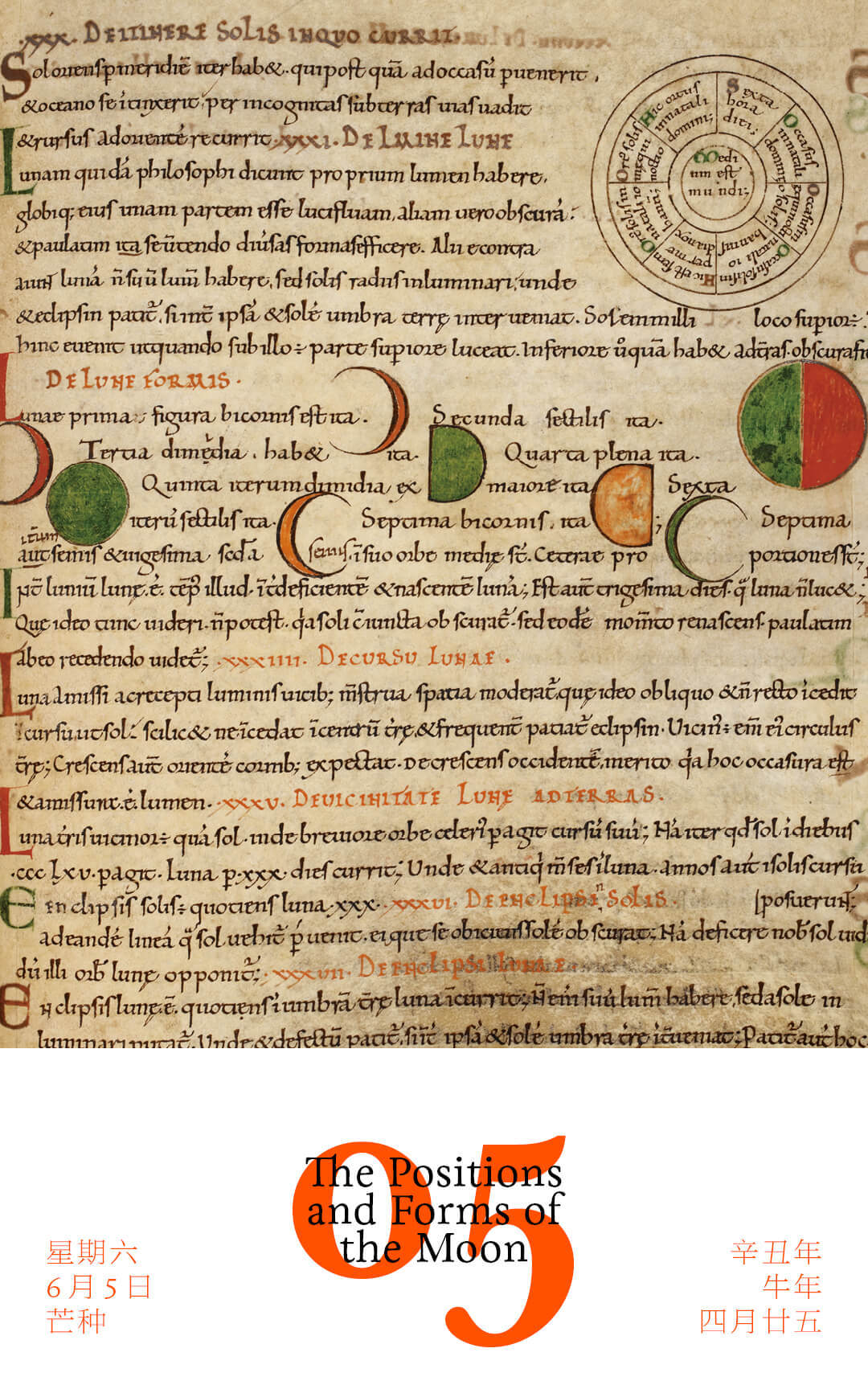 在这页手稿上,作者用鲜艳的颜色描绘了月亮的位置和盈亏状态。
