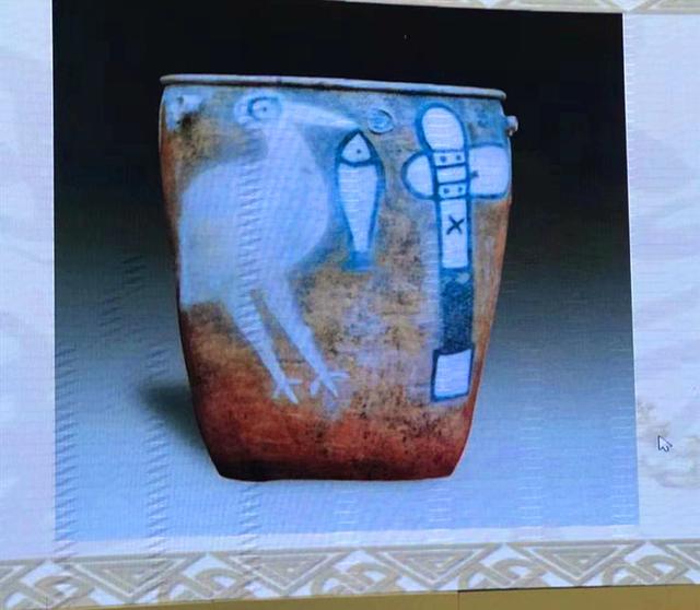 器腹外壁的一侧绘有著名的鹳鱼石斧图。图高37厘米,宽44厘米,约占缸体表面积的一半,画面真实生动、色彩和谐、古朴优美,极富意境,是迄今中国发现最早、面积最大的一幅陶画。收藏于中国国家博物馆。2003年被国务院确定为64件不可出境展出的珍贵文物之首。