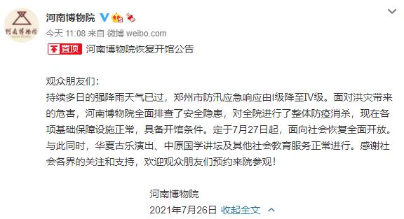 近日,河南遭遇暴雨,河南博物院也临时闭馆,7月26日,@河南博物院 发布恢复开馆公告。