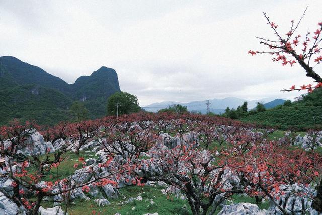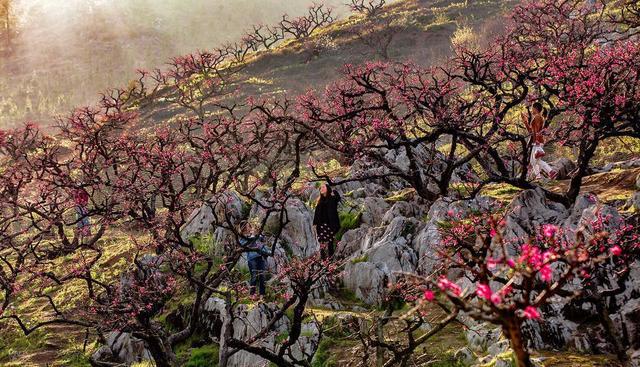 李洞村桃花谷的桃花生于一颗颗怪石之间,放眼望去,宛若一幅幅水墨画,因而被称为“水墨桃花”,其树形奇特,枝干遒劲,暖阳下,颜色特别红艳,素有“南岭最美”之称。走进桃花谷,漫山遍野的桃花缀满枝头,在横错别致的白石间明媚鲜艳,如诗如画。