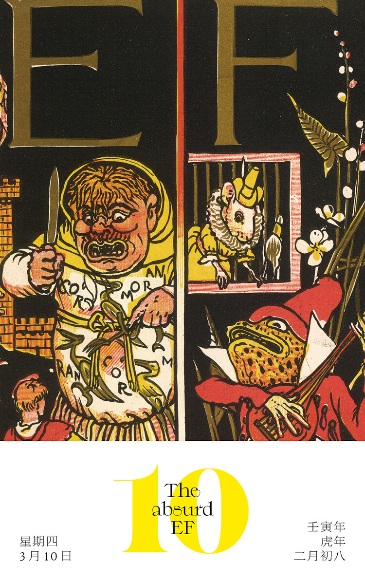 在这幅插图里,E是Englishman,英国人。对应的童谣是这么说的:你认识的英国人,正要捉拿大巨人,巨人拿他当点心。