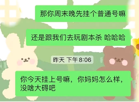 “倒也不必讲这样的话,我说了当时就是脑袋一热,而且习惯性地用哈哈哈,我以为他当时是找了个拒绝跟我去玩剧本杀的理由,因为本来我们是约好周末去的,他说什么周末挂专家号,周末本来就挂不了专家号。”