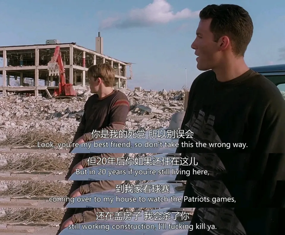 他和朋友们一起去工地上做建筑工人,一起打架,一起喝酒,一起玩,对于威尔而言,他的朋友好像他的家人。