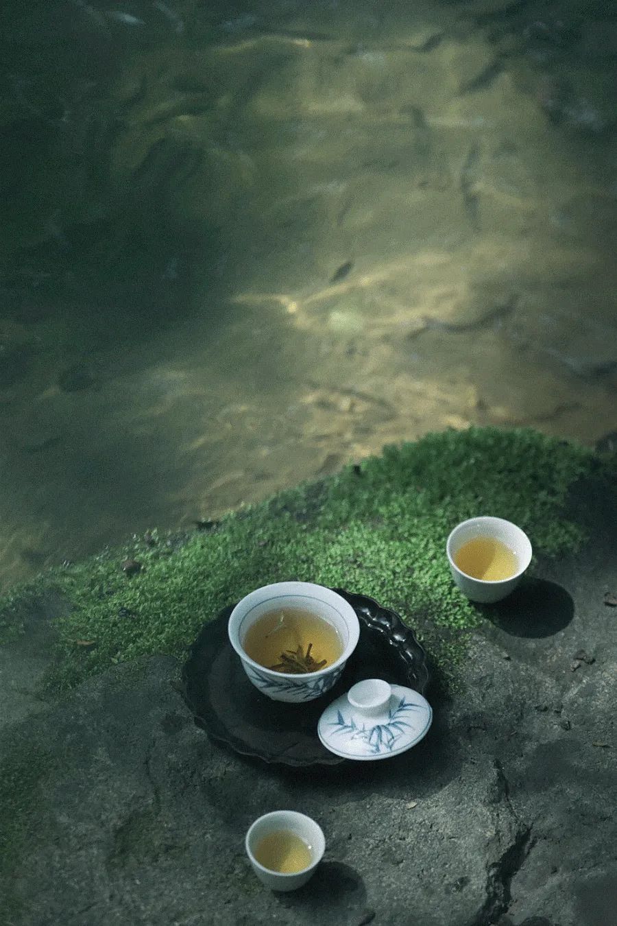 一觞一咏之间,王羲之抬眼望去,看到崇山峻岭间山雾缭绕,茂林修竹一片青葱,把清澈的流水染成翠绿,漂浮着酒杯,令人心旷神怡。
