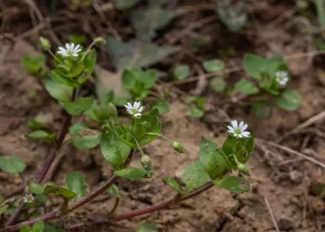 在温暖地区,石竹科的繁缕(Stellaria media)可以四季常绿,早至二月份冰雪封冻时就已零星开花。三月是盛花期,开放时众多白色小花犹如满地繁星,实际上,它的属名也是星星的意思。