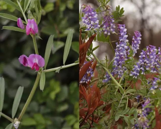 作为蔬菜的蚕豆(Vicia faba)在我们这里二月份就开花了,而它的两个杂草亲戚会在三四月份先后开放。救荒野豌豆(V. sativa)的花很好玩,两片深紫红色的翼瓣配上宽大的旗瓣,颇像是涂了红唇的人脸。广布野豌豆(V. cracca)常和前者伴生,但花期稍晚,体型更大,紫色的花组成一串串总状花序,观赏效果也很好。但带卷须的叶子会让它到处乱爬,覆盖力很强。