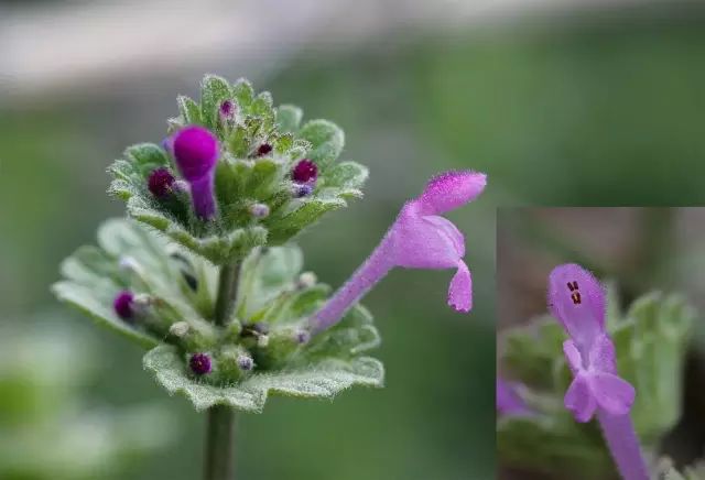 因为自身结构的原因,唇形科好看的花不多,宝盖草(Lamium amplexicaule)就是其中之一。叶子层层叠叠如亭台如华盖,从中间探出数枝细长的紫红色花冠,末端突然变大,分为上下二唇,下唇还往外延伸了一截,侧面看好像在吐舌头的小动物,又像伸着手臂的小人,但是正面就是一副惊恐脸了。