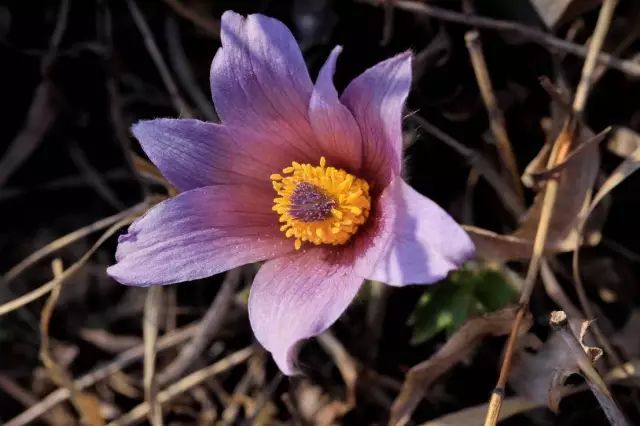 另一种毛茛科植物更大更引人注意——白头翁(Pulsatilla chinensis),它本是喜阳的高山植物,在我们这里比较少见,因为花色艳丽,手贱的游人看见免不了要被拔走。那些蓝紫色的花瓣一样的结构其实是萼片,如能侥幸活到果期,才能看出它名字的来历——众多带有长毛的瘦果聚在一起,组成一个白发魔女一样的大毛球。铁线莲属一些植物的果期也有这样的大毛球。