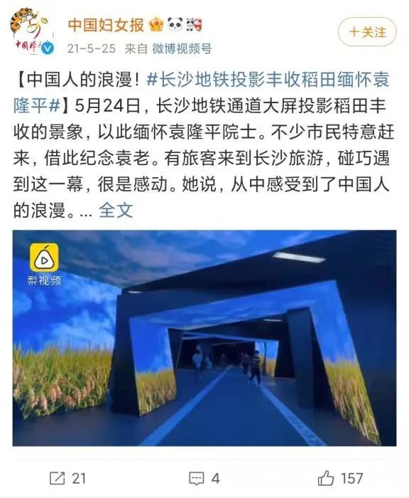 在某档建造类游戏中,有网友搭建出了一座巨型水稻雕塑,以此缅怀袁隆平。长沙地铁2、4号线换乘站溁湾镇站也利用大屏投影技术,在地铁上“种满”了杂交水稻。