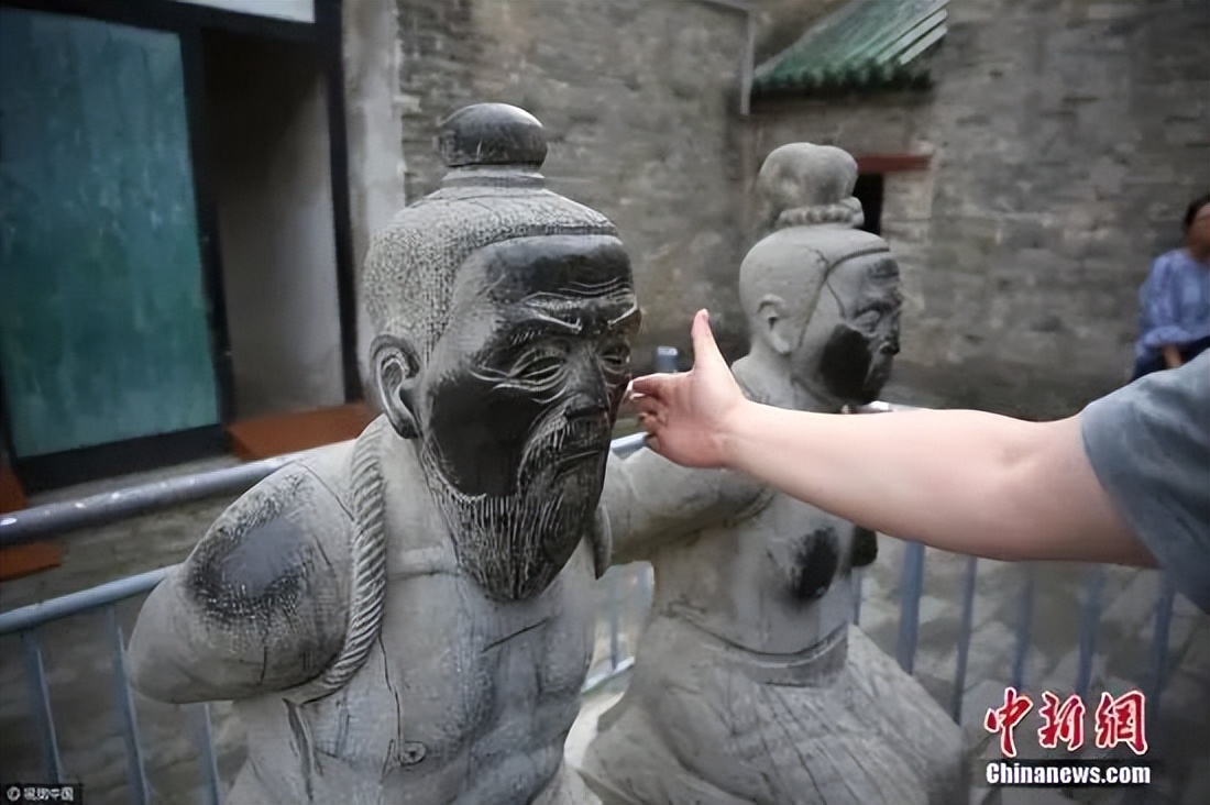安徽亳州花戏楼景区内的岳武穆王庙门前,游客掌掴秦桧跪像。图片来源:视觉中国