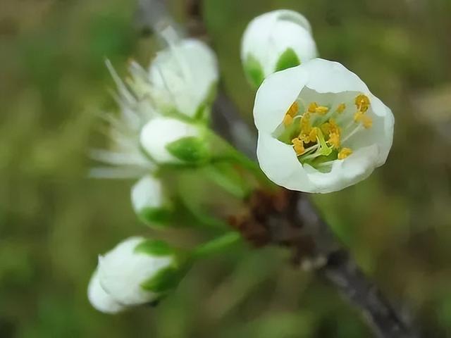 李,花叶同出,两至三朵并生于枝头,花蕊黄色,花梗较长。