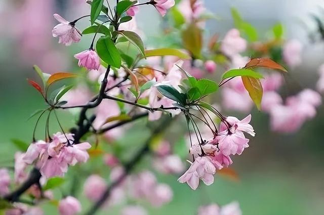 花瓣也多为粉色,相对于垂丝海棠低垂下的娇羞,西府海棠则以一种仰望天空的姿态傲然绽放。