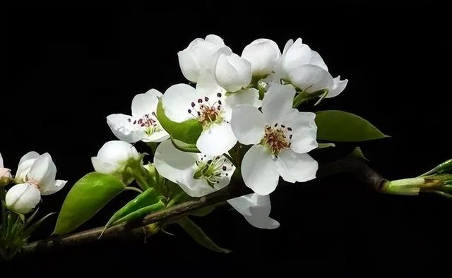 《广群芳谱》说:“梨树似杏,高二三丈,叶亦似杏,微厚而硬,色青,光腻有细齿,老则见斑点。二月间开白花,如雪六出。”每次看到梨花都想到雪,岑参“忽如一夜春风来,千树万树梨花开”则将白雪比作梨花,虽反喻,却也突出了梨花最大的特点,花白色。