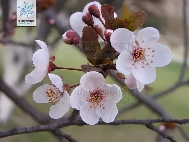 其花朵很容易与樱花混淆,但是紫褐色的新叶是其识别标志,另外,紫叶李也是没有樱花花瓣尖端的缺刻的。