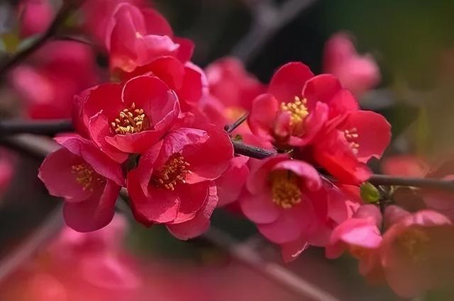 《琐碎录》曾言:“樱桃接贴梗海棠者,则成垂丝海棠;梨树接贴梗者,则成西府。”可见,上面两类国色天香的海棠中均有贴梗海棠的基因。但相对于垂丝海棠与西府海棠的粉嫩娇俏,贴梗海棠有自己独特的魅力。