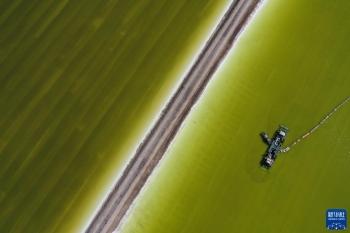 4月1日,采盐船在青海盐湖工业股份有限公司钾肥分公司的盐湖工作(无人机照片)。