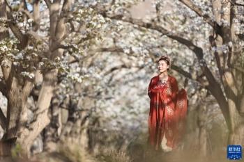 4月7日,景区工作人员在百年梨园内进行表演。