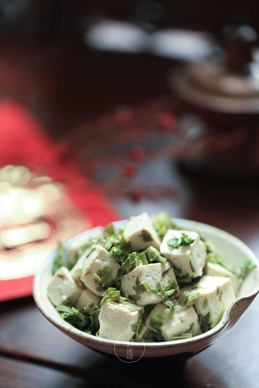 椿芽拌豆腐,是最有春色的一道菜。一块豆腐,几株香椿,几滴香油,简简单单。绿如翡翠,白如羊脂,正如春天;一口下去,软嫩爽口,清甜醇香。难怪汪曾祺有所偏爱:“一箸入口,三春不忘。”