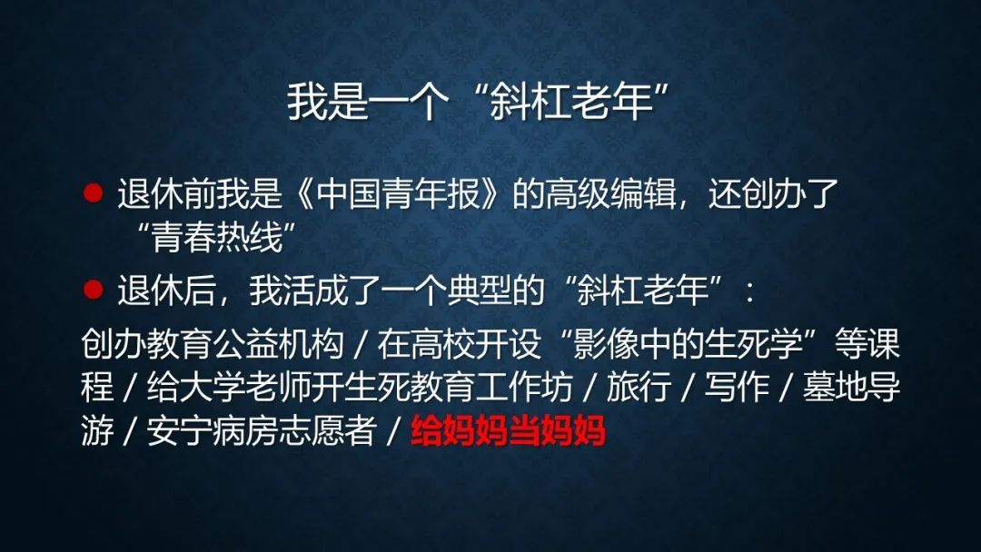 大家好,我叫陆晓娅,退休前在《中国青年报》工作,还创办了给青少年提供心理支持的“青春热线”;退休后在公益领域、教育领域和生死学领域做了一些自己想做、喜欢做的事情,把自己活成了一个“斜杠老年”。在诸多“斜杠”中,有一个角色并不在我的计划之中,甚至也不是我期待的,这就是给妈妈当妈妈。