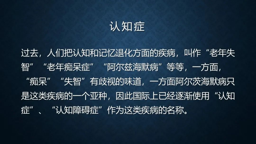 什么是认知症?这个词儿您可能听着有些陌生,但如果我说“老年失智”、或者带有歧视性的“老年痴呆”,或者有点拗口的“阿尔茨海默症”,您大概就知道我说的认知症是什么意思了,也不难想象我将要面对的挑战是什么。