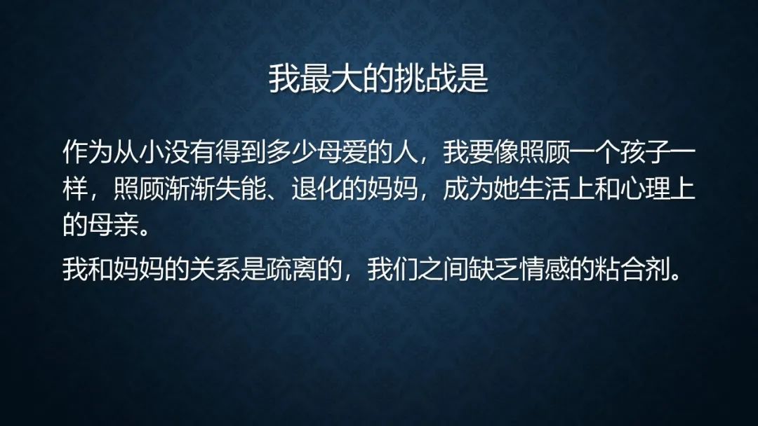 我在网上看了很多资料,真是越看越害怕,当我知道有些认知症患者能活十年以上,我感到的不是幸运,而是委屈和恐惧。我觉得自己没有得到过多少母爱,现在却要付出很多时间和心力来照顾老妈。
