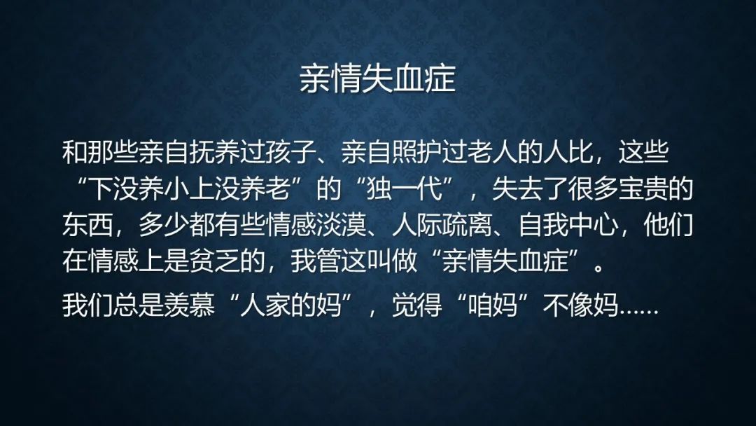 他们虽然可能在工作中有很多成就,却不知道这种特别的生活经历,让他们也失去了很多宝贵的东西,比如在一把屎一把尿中把孩子拉扯大所建立起来的依恋和信任,在一杯水一餐饭中承担的家庭责任和表达的爱意,在一次亲吻一个拥抱中表达出来亲情和支持……总之,我觉得那是人性最深处的温暖和柔软,是爱的愿望和能力,是生命中活泼与欢快的来源。和那些亲自抚养过孩子、亲自照护过老人的人比,这“独一代”人多少都有些情感淡漠、人际疏离、自我中心,他们在情感上是贫乏的,我管这叫做“亲情失血症”。