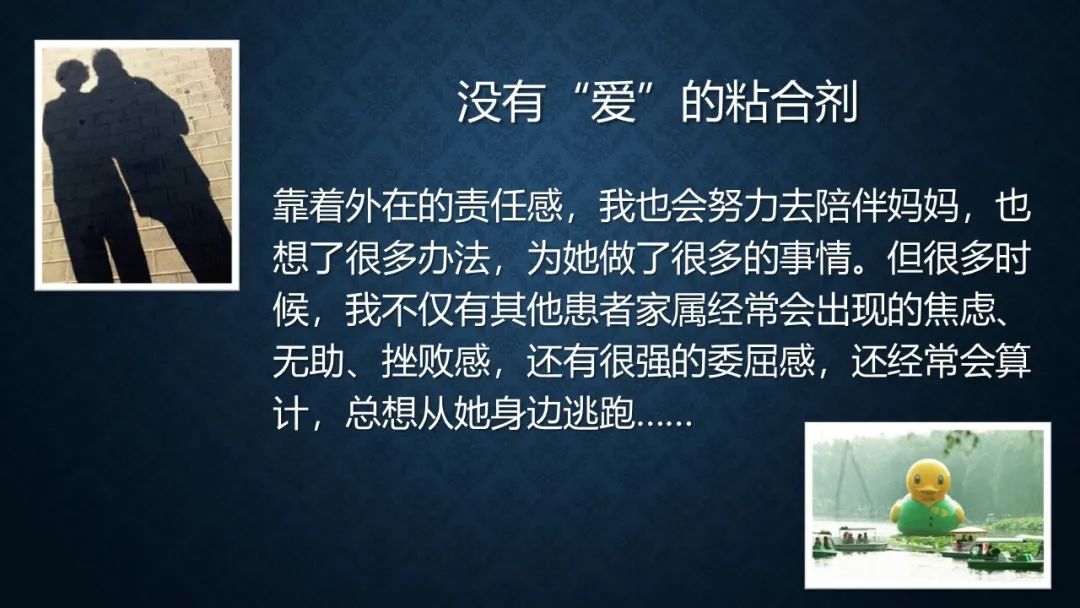 随着这种心态上的改变而来的,陪伴不再是一种无奈和煎熬。我在陪伴妈妈时不仅有了更多的耐心,也有了更多的办法。我们通常会把“陪伴”当成一个没有技术含量的事情,其实陪伴认知症患者,是特别需要知识、技能和创意的。随着这种心态上的改变而来的,陪伴不再是一种无奈和煎熬。我在陪伴妈妈时不仅有了更多的耐心,也有了更多的办法。我们通常会把“陪伴”当成一个没有技术含量的事情,其实陪伴认知症患者,是特别需要知识、技能和创意的。