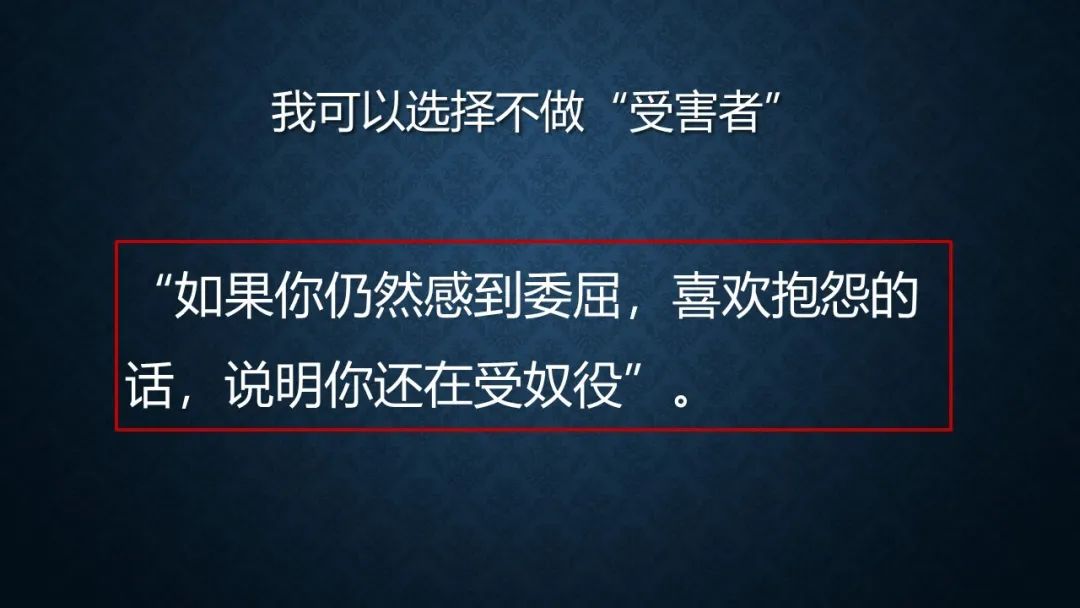 后来有一天我在微信中看到一句话,一下子惊醒了我:“如果你仍然感到委屈,喜欢抱怨的话,说明你还在受奴役”——是的,我仍然被母爱缺失的心理阴影所支配,我仍然把自己当作一个“受害者",我仍然没有获得精神上的自由。