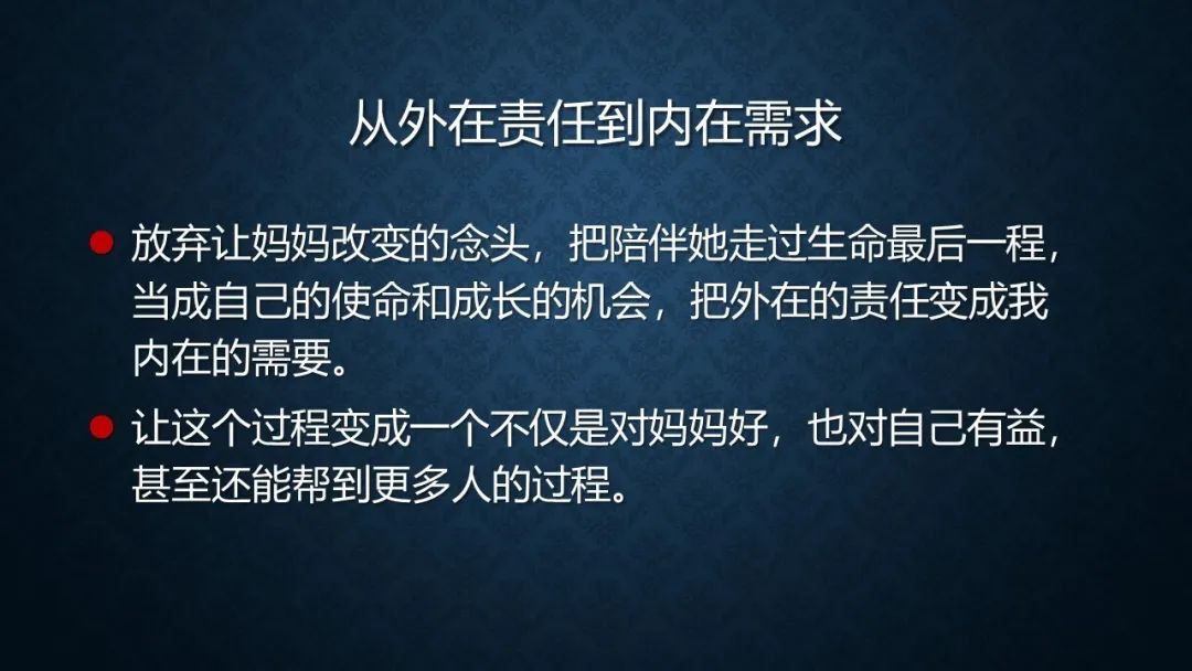 好吧,要从奴役中解放自己,只能放弃让老妈改变的念头。如果说,缺少母爱的我,注定了要去陪伴老妈走过她生命中最幽暗的一段路的话,就把它当成一个机会、一个使命吧!照顾好她,仅仅是为了她吗?不是,也是为了将来我不会后悔,也是为了我自己和我的孩子最终能超越“亲情失血症”的影响,成为有情有义的人,生活在有情有义的关系中。