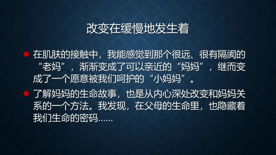 我知道了,她小时候也受了很多委屈,她的冷漠与疏离,与她自己从小没有得到太多的关爱、曾强烈感受到被不平等对待有关;我也理解了,“要强”是她确立自己生命价值的一种方式,作为一个女性,她通过“要强”与命运抗争,摆脱封建束缚,成为一个有能力自立于社会的独立女性;我还知道了,原来想成为化学工程师的她,因为有了我,不得不牺牲了自己的大学学业,她说一辈子没有做自己喜欢且擅长的事情,是她最大的遗憾……妈妈生命中的这些故事,让我看到她并非像我们想象的那样“天生没有感情”,我看到了她生命中的不容易,也看到了她的了不起的地方,甚至看到了我与她的相似之处。