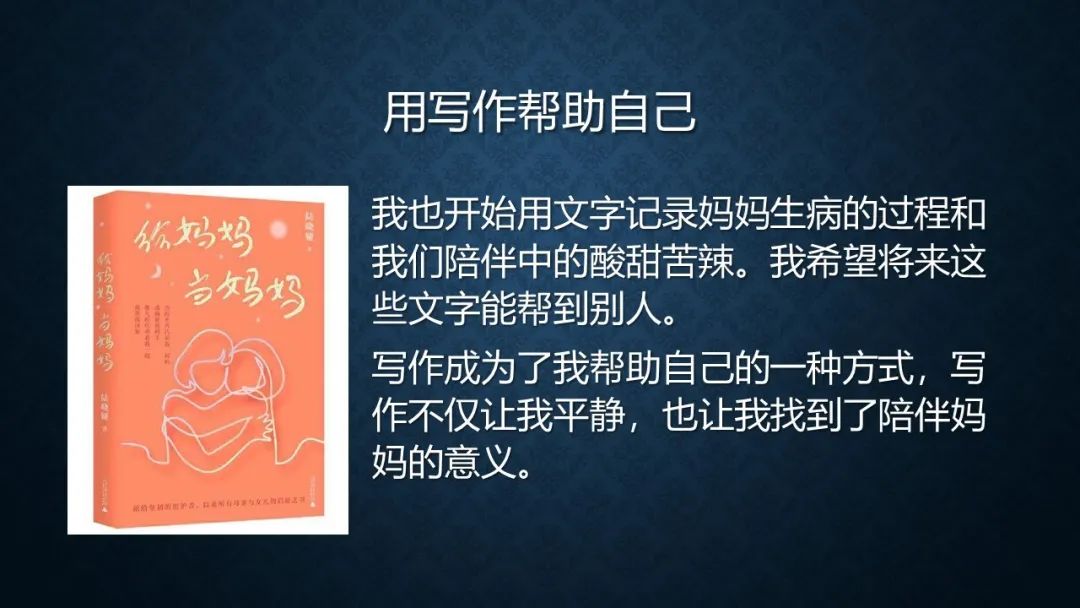 我也开始记录陪伴妈妈的过程,记录她的退化历程,记录我们遇到的煎熬和挑战,也记录我们应对这些困难的办法和“招数”,记录我如何处理自己的情绪、如何寻找支持的力量。写作成为了我帮助自己的一种方式,写作不仅让我平静,也让我找到了陪伴妈妈的意义。于是就有了这本《给妈妈当妈妈》。