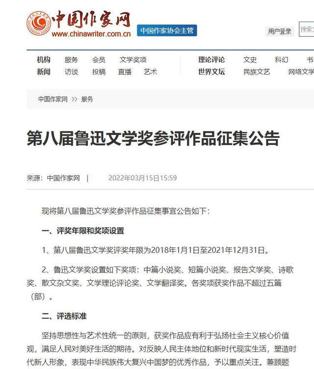 第八届鲁迅文学奖评奖工作于2022年3月15日正式启动。鲁迅文学奖由中国作家协会主办,是中国具有最高荣誉的文学奖之一,旨在奖励优秀中篇小说、短篇小说、报告文学、诗歌、散文杂文、文学理论评论,奖励文学翻译的优秀成果,推动中国文学事业的繁荣发展。