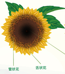 与绝大多数菊科植物一样,向日葵的头状花序(俗称花盘)上也有两种花——边缘的舌状花和中央的管状花。