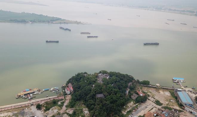 长江和鄱阳湖在江西省九江市湖口县石钟山附近交汇,形成江湖两色美景(2018年8月5日无人机拍摄)。新华社记者金立旺摄