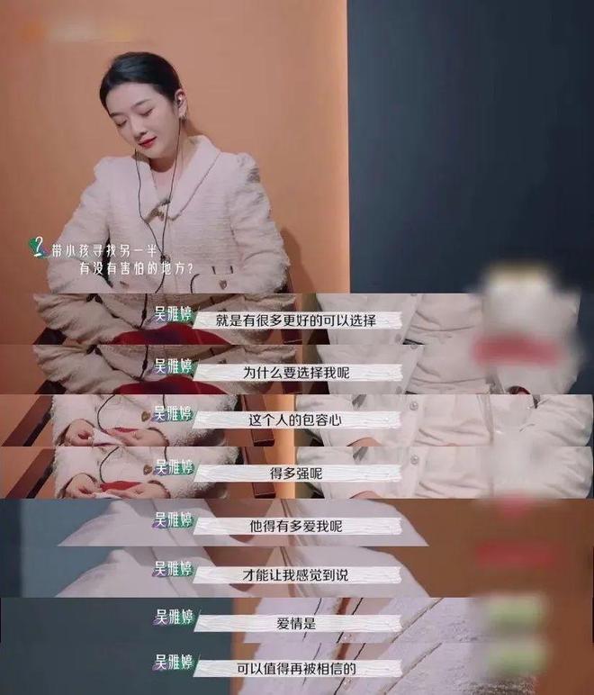 吴雅婷甚至说自己“没有资格再接受一段爱情”。“别人有很多更好的可以选择,为什么要选一个肚子上有赘肉、疤痕的女人呢?”