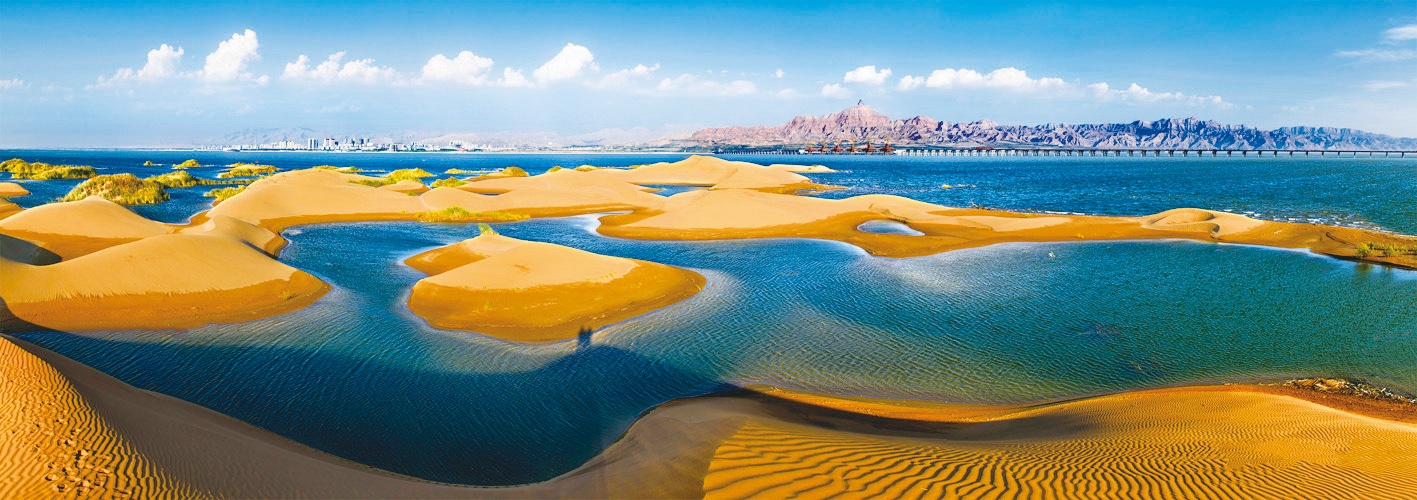 乌海湖地处风景区的核心位置,北接水利枢纽大坝,西接乌兰布和沙漠,南接黄河乌海段上段河道,东临乌海市滨河景观带,远处还有甘德尔山脉,丰富的景观与平静如镜的湖水融为一体。