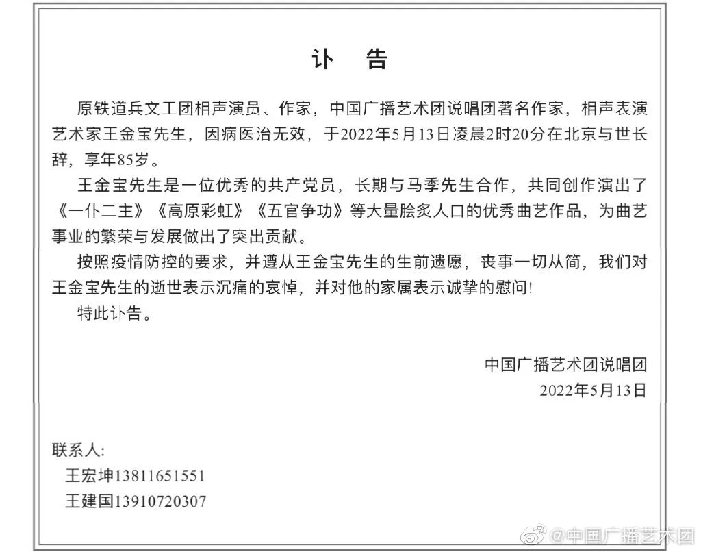 据“中国广播艺术团”消息,中国广播艺术团说唱团著名作家,相声表演艺术家、原铁道兵文工团相声演员、作家王金宝先生,因病医治无效,于2022年5月13日凌晨2时20分在北京与世长辞,享年85岁。