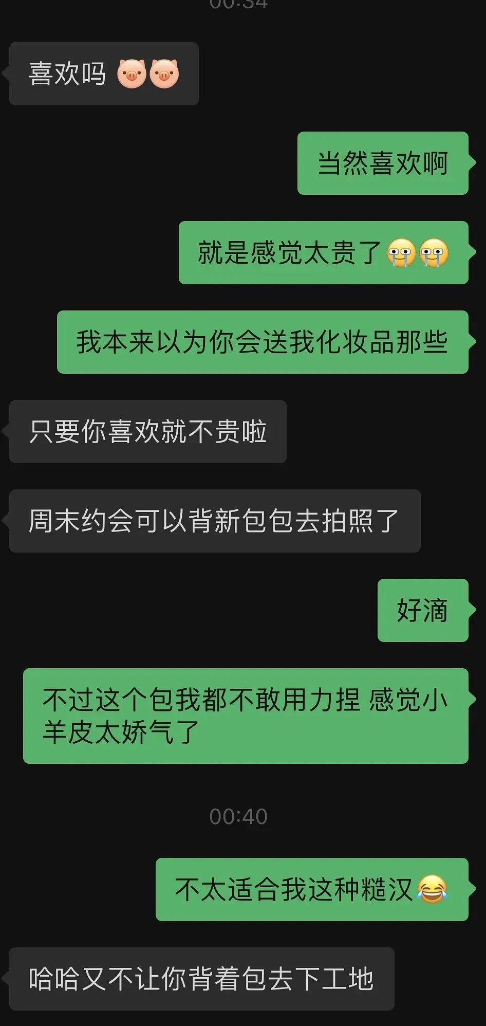 男友依然还是用幽默的方式化解她的负担:“哈哈又不让你背着包去下工地。”