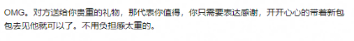 有人试图开导她:“对方送你贵重的礼物,那代表你值得,你只需要表示感谢,开开心心地带着新包去见他就可以了,不用负担感太重的。”