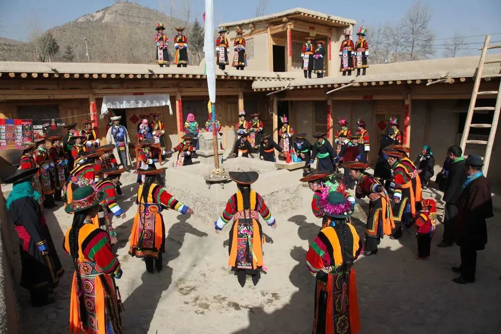 每年冬天,土族人闲下来,就会聚集在打麦场转轮子秋、跳安昭舞,纵情享受丰收年景带来的欢乐时光。红红的篝火,暖暖的青稞酒,赤橙黄绿青蓝紫组成的花袖衫,在成片土黄色的庄廓映衬下,显得更加绚丽多彩。人们对美好生活的热情,像和煦的春风温暖了高原寒冷的冬天。