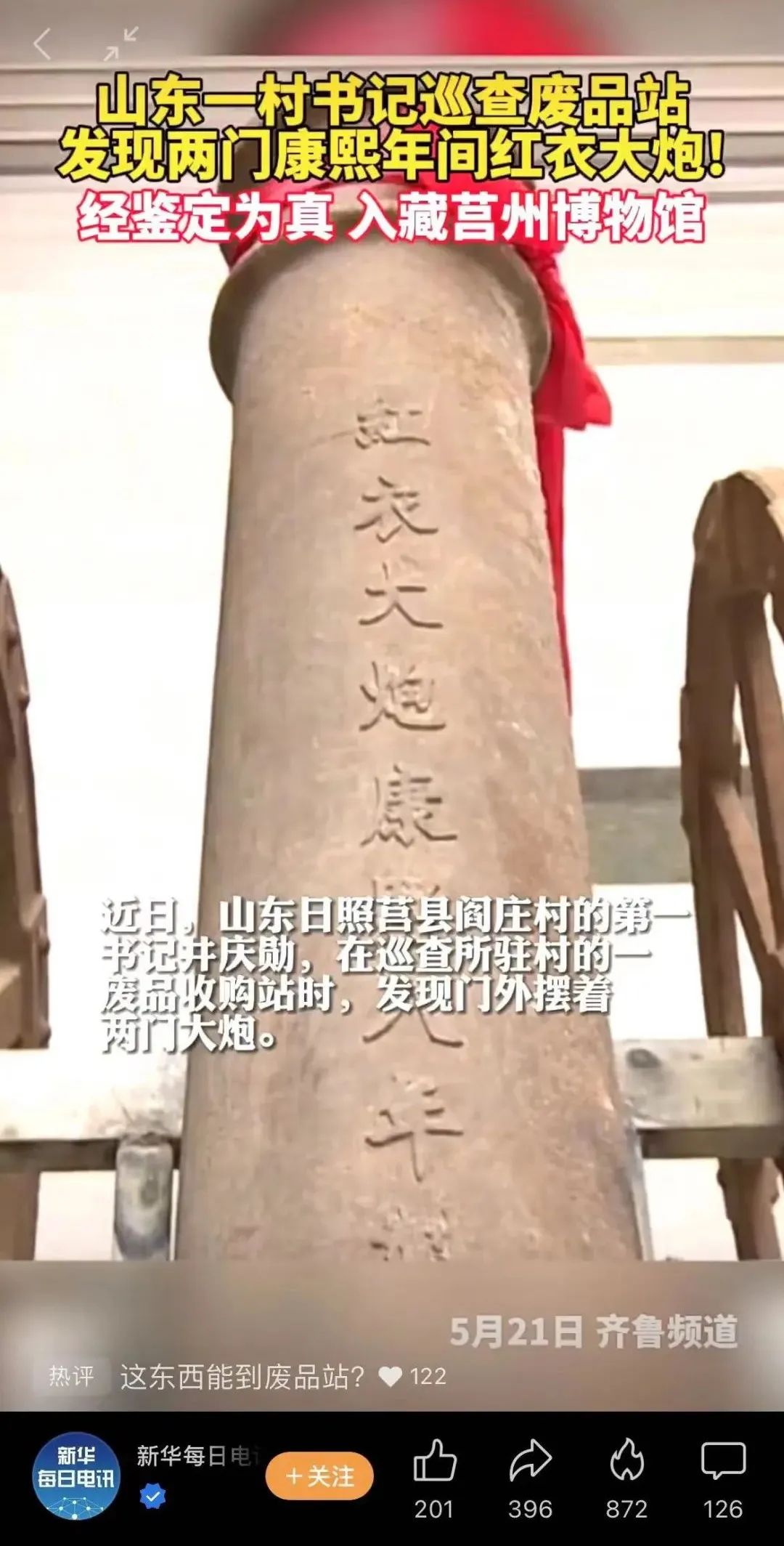 近日,山东卫视报道了一则新闻,日照市莒县一名驻村书记在废品站偶然发现了两门写有“康熙八年制”的“红衣大炮”,随即上报文物部门。经专家鉴定,确认两门大炮是真品文物。随后工作人员做通了废品站老板的工作,将大炮送入莒州博物馆。