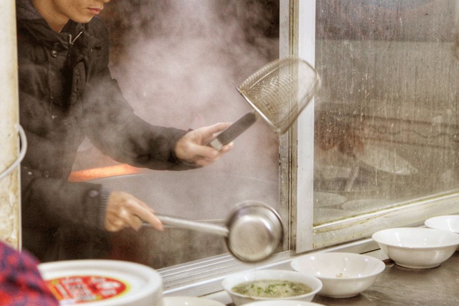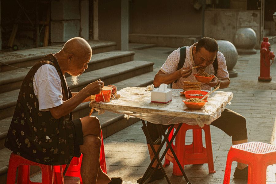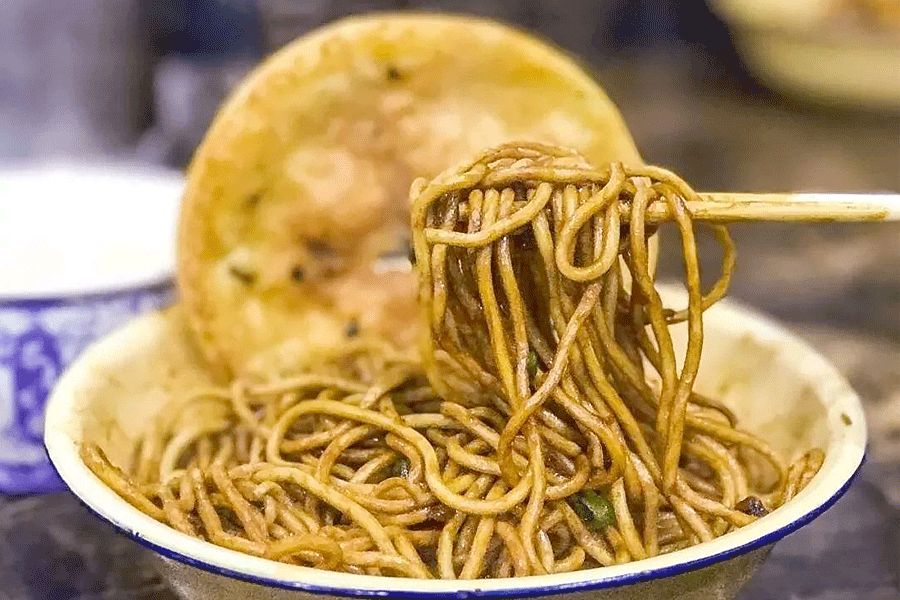 人们或扯来一张马扎,坐在街头,或站着、倚着、蹲着,把面拌一拌,任酱粒随意挂在面上,几分鲜香,哧溜哧溜一顿,满意地摸摸肚子,走进能量满满的一天。