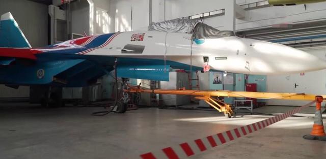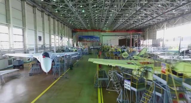 俄共青城飞机制造厂内的苏-35S战机生产线内景。