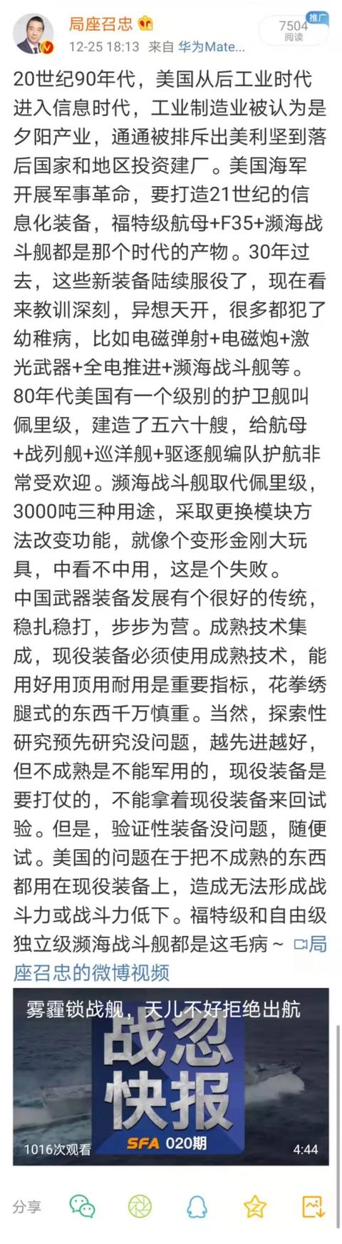但是,我们要辨证的看问题,有优点就一定有缺点。局座在节目里说过,这个濒海战斗舰最大的缺点,就是上述的那些优点,它都很难实现……美国想把濒海战斗舰设计成多功能的轻型战舰,啥都往上堆,但效果却并不是很好。濒海战斗舰自服役以来,事故频发。