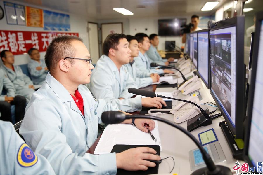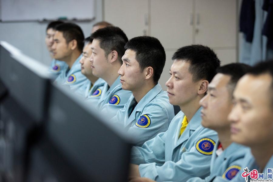 远望3号船上测控系统工作人员模拟跟踪测控卫星状态。王雪岩 摄
