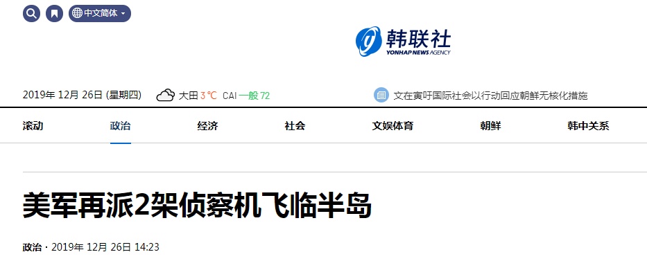【环球网综合报道】韩联社26日消息称,在朝鲜预告给美国送上“圣诞礼物”的情况下,美军26日当天再次派出2架侦察机飞临韩半岛上空,进一步加强对朝监视。