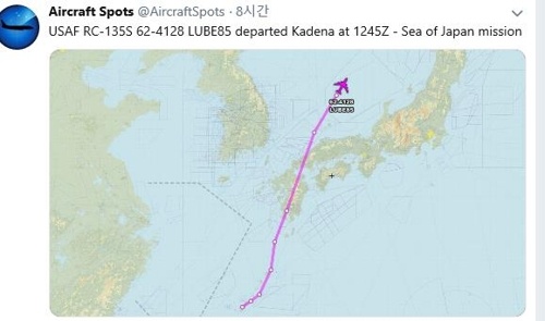 美军侦察机RC-135S从冲绳美军驻日基地出动飞临韩半岛东部海域上空。 飞机守望官方推特截图