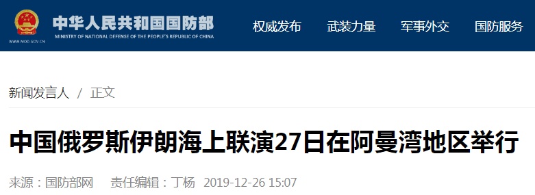 在今天的国防部例行记者会上,国防部新闻局局长、国防部新闻发言人吴谦大校称,今天有两条信息需要主动发布,第一条关于中国、俄罗斯、伊朗海上联合演习。